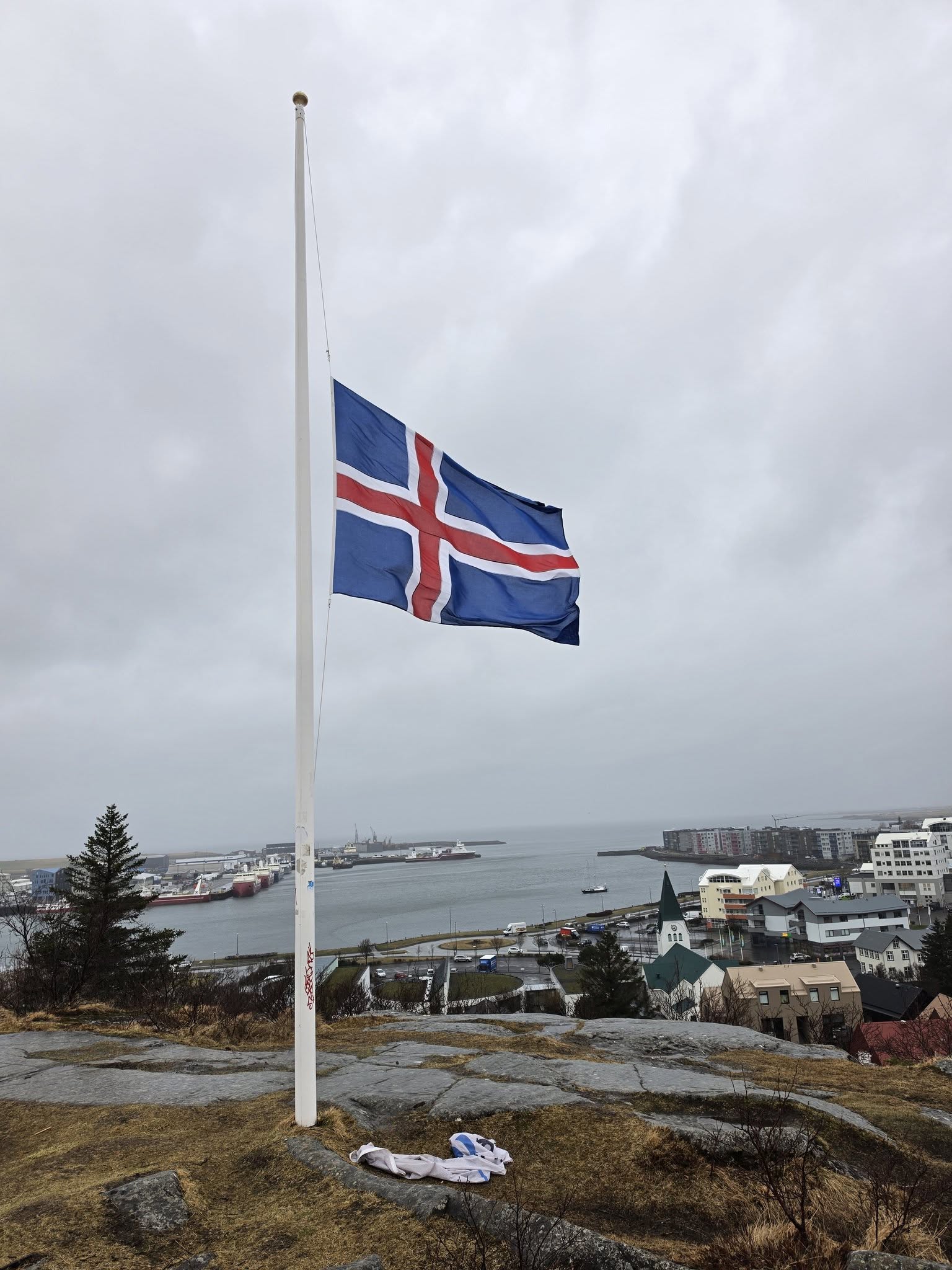 Flaggað er í hálfa stöng víða um bæinn í dag, en meðfylgjandi mynd tók Sigurjón Sigurjónsson, tækjamaður hjá þjónustumiðstöð Hafnarfjarðar, uppi á Hamrinum. Útförin hefst sem fyrr segir í Hallgrímskirkju klukkan 15:00 og í kjölfarið verður haldin erfidrykkja í íþróttahúsi Hauka að Ásvöllum.